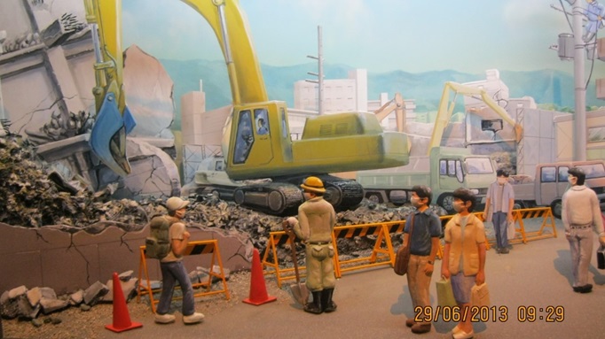 Tidak kalah menariknya, di dalam museum tersebut juga disediakan ruangan khusus tentang pengalaman dan upaya proteksi untuk meminimalisasi kerusakan akibat bencana gempa bumi. Misalnya, di ruangan tersebut para pengunjung diajak untuk belajar tentang menghadapi bencana dan bagaimana penduduk dapat melindungi diri dari bencana dengan didemonstrasikan melalui anekaragam permainan menarik. Contohnya, ada suatu permainan yang menunjukkan tentang simulasi besarnya goncangan gempa di suatu tempat yang dipengaruhi oleh jaraknya dari pusat gempa. Informasi tersebut diberikan dalam ilustrasi berbentuk permainan interaktif mainan ikan lele. Di atas permukaan meja kaca diletakan mainan berbentuk ikan lele, diibiratkan sebagai gambaran pusat gempa. Lantas, ikan lele tersebut dapat digeser-geser posisinya dari permukaan meja kaca sampai bagian bawah jauh dari permukaan meja kaca. Posisi mainan ikan lele, merupakan suatu analogi gambaran pusat gempa di daerah dangkal atau jauh di dalam laut. Mainan ikan lele tersebut terhubung dengan kabel listrik yang dapat mengirim sinyal untuk menggerak-gerakkan boneka-boneka yang disimpan di atas meja. Misalnya, apabila mainan ikan lele ditempatkan di posisi tidak jauh dari permukaan meja, memicu getaran yang mengguncang boneka-boneka yang diletakkan di atas meja. Jika goncangan cukup keras, bisa saja membuat boneka terjungkal jatuh. Hal tersebut menjukkan dampak yang terjadi pada suatu wilayah yang sangat dekat dengan pusat gempa. Tetapi, sebaliknya ketika ikan lele digeser ditempatkan lebih jauh dari permukaan meja kaca, maka boneka-boneka di atasnya hanya mendapat goncangan tidak keras dan tidak menyebabkan terjungkalnya dari atas meja kaca. Hal ini menggambarkan dampak gempa disuatu kawasan yang letaknya jauh dari pusat gempa umumnya mendapatkan goncangan yang tidak terlalu dahsyat.