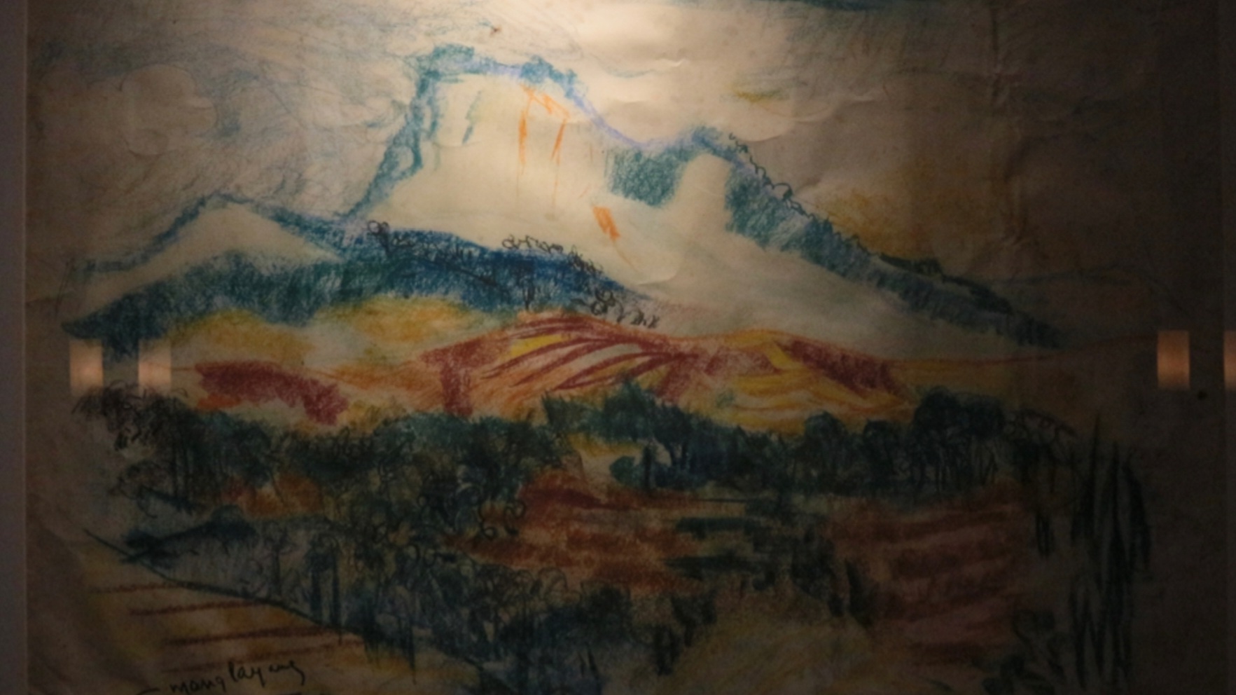 BandungBergerak – Di atas kertas yang menguning dan bergelombang, guratan pastel menangkap lanskap pegunungan di arah timur cekungan Bandung. Hutan-hutan berwarna kebiruan bersinggungan dengan garis-garis kecokelatan yang membentuk kontur, merepresentasikan perkebunan sebagai sumber kehidupan masyarakat. Ketiadaan figur-figur manusia dalam karya berdimensi 80 x 60,5 sentimeter ini memberi kesan wilayah utara Bandung yang sunyi. Jauh dari riuh hari ini.