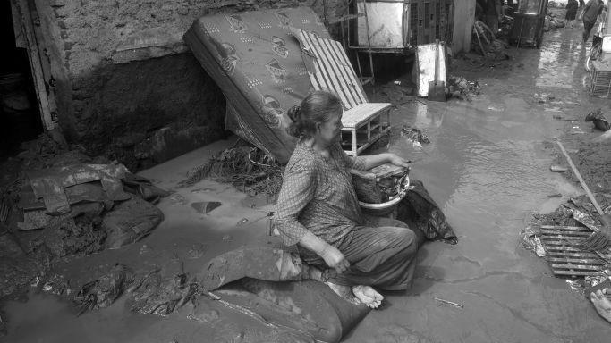 Pagi harinya, air mulai surut. Lumpur tebal menutup jalan desa dan gang-gang sempit. Perabot rumah tangga berserakan di jalan. Sebuah mobil terseret arus dan tersangkut di ujung kampung, tertahan tumpukan bal plastik.