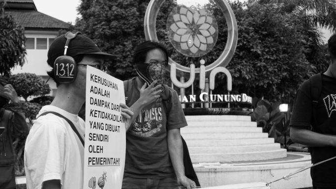 BandungBergerak - Di bawah rindang pohon halaman tugu kujang Universitas Islam Negeri Sunan Gunung Djati (UIN SGD) Bandung, tampak para mahasiswa dan mahasiswi berkumpul. Mahasiswa mengangkat pengeras suara, menyuarakan kematian seorang anak, Arianto Tawakal setelah dipukul polisi, sebagian dari mereka membawa payung-payung hitam, dan yang lainnya membawa poster-poster berisikan kutukan atas tindakan represif tersebut.