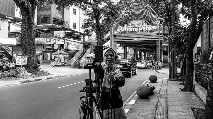BandungBergerak - Di atas trotoar dengan latar belakang Teras Cihampelas, Ade Ariani bernyanyi sambil menyapa penonton melalui siaran langsung TikTok dari ponselnya. Di depannya berdiri tripod setinggi tubuhnya, menopang gawai yang merekam penampilannya. Sebuah mikrofon terhubung ke sound card kecil, sementara ring light menyala menerangi wajahnya. Dengan peralatan sederhana itu, Ade menghibur penonton yang menyaksikan dari layar mereka.