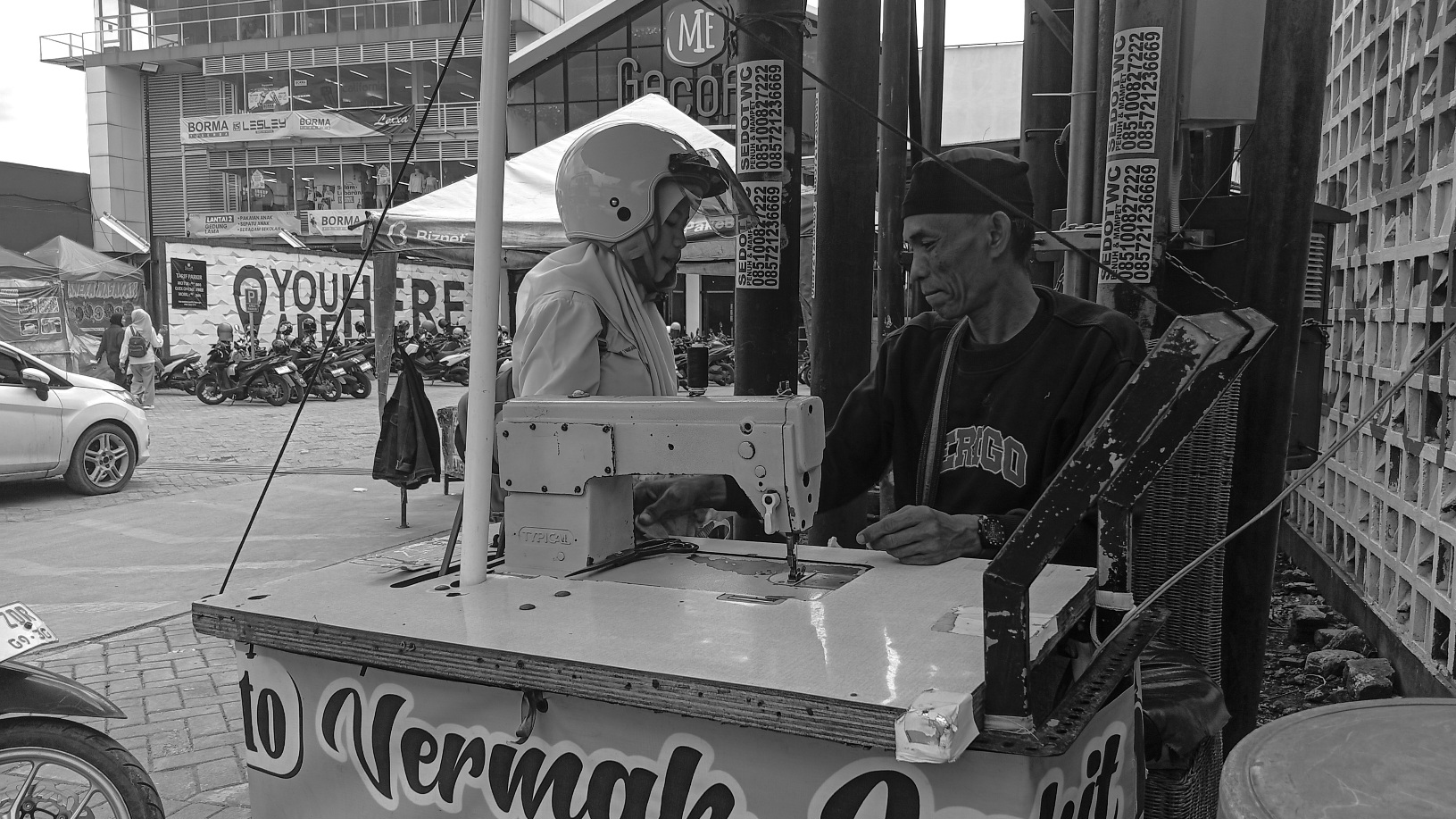 Selama mengobrol dengan saya, Ato tidak sepenuhnya menghentikan aktivitas menjahitnya. Ia menuntaskan pesanan juru parkir di dekat lapaknya. Di penghujung percakapan, dua orang perempuan muda memakai seragam putih abu-abu datang menggunakan sepeda motor untuk memotongkan pakaian.