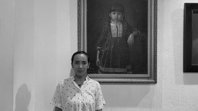 Di sudut ruangan, satu lukisan terasa lebih personal. Potret Indah kecil berdiri dengan tangan kiri bertumpu di meja. Rambutnya berponi dan dikepang rapi.