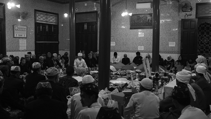 Setelah semua pusaka tersusun dan semua kerabat sudah lengkap berada di dalam masjid, pintu-pintu besar masjid ditutup. Pembacaan kitab Barzanji yang menceritakan kelahiran Nabi Muhammad SAW dimulai. Semua yang ada di dalam masjid terdiam sambil menyimak.
