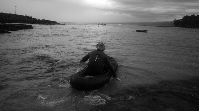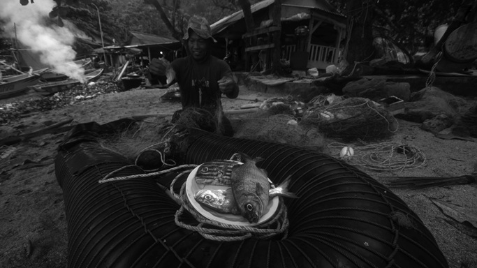 Perlahan, dua jaring perangkap ditarik dari kedalaman dan dimuat ke atas rakit ban yang dimodifikasi sendiri. Setelah itu, mereka segera kembali ke pesisir untuk memeriksa hasil tangkapan. Jangan bayangkan dayung yang rapi seperti milik wisatawan yang mengayuh kano atau papan dayung. Bagi nelayan ban, sepasang piring plastik adalah alat pendayung yang setia menemani kerja mereka di laut.