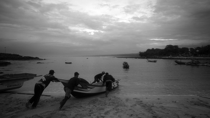 Di pesisir, perahu-perahu nelayan bergegas meninggalkan pasir putih, merayap di antara sela-sela karang-karang. Awan mendung menggantung rendah. Mereka harus segera menuju bagang untuk memanen benih bening lobster sekaligus mengganti baterai sebagai sumber energi lampu-lampu LED pemikat BBL sebelum cahaya matahari kian terang.
