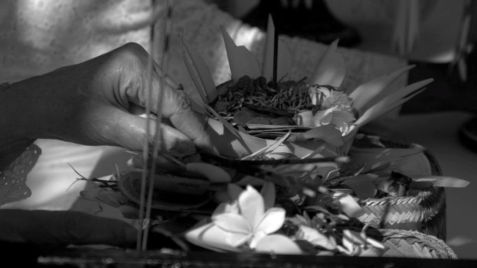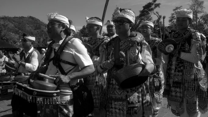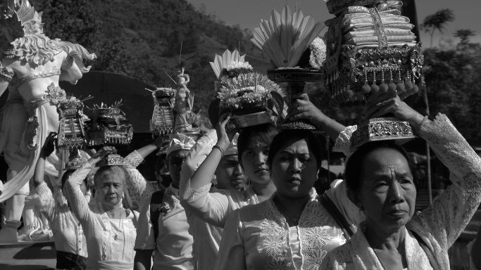 Ratusan umat Hindu yang mengusung banten dan gebogan di atas kepala mereka satu per satu masuk ke area upacara. Benten dan usungan jempane berisi benda-benda sakral disusun rapi di atas meja besar. Jari-jari perempuan mengatur letak banten. Ada bunga-bunga, makanan kecil, uang kertas, dan hio, dalam wadah terbuat dari janur kuning.