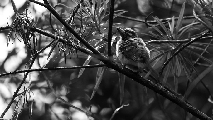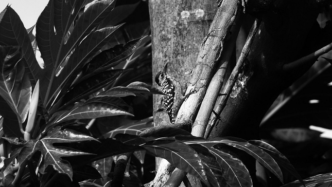 Di bagian bawah pohon sukun yang masih ditumbuhi daun cukup lebat, seekor burung pelatuk ulam (Dendrocopos macei) hinggap dengan posisi vertikal, paruhnya mematuk-matuk dahan pohon untuk mencari serangga atau ulat. Warna bulu kombinasi hitam putih dengan jambul warna merah, terkamuflase sempurna di antara warna kayu dan daun. Burung liar ini mulai jarang terlihat dalam waktu beberapa tahun terakhir.