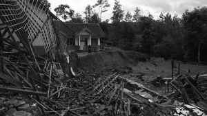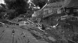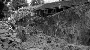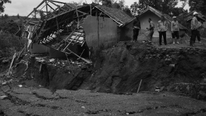 Warga di Kampung Cigombong, Kabupaten Bandung Barat mengungsi karena tanah mereka bergerak dan amblas 1-2 meter. Anak-anak sekolah pindah ke sekolah tetangga.