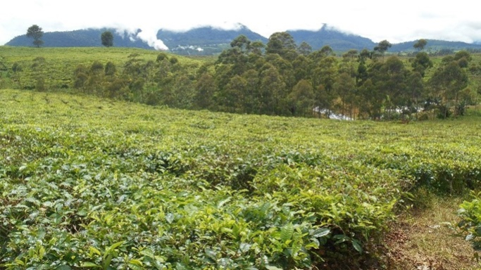 Perkebunan Teh Kertamanah Pangalengan dengan latar belakang asap putih dari Geothermal Wayang Windu. (Foto: Johan Iskandar)Mengamati Keanekaragaman Burung di Perkebunan Teh Sukamanah di Pangalengan
