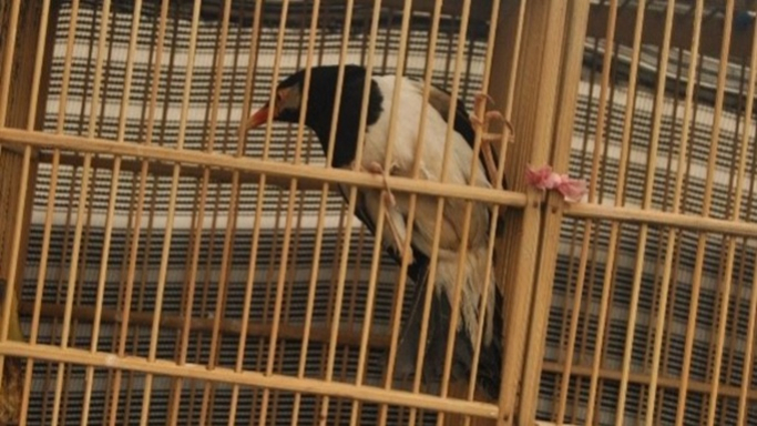Burung Jalak Suren di dalam sangkar sedang diperdagangkan di pasar burung. (Foto: Johan Iskandar)Hilangnya Burung Jalak Suren di Ekosistem Perdesaan