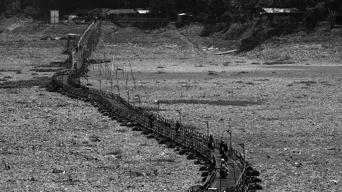 Warga naik sepeda motor diatas jembatan apung Sungai Citarum yang mengering, Cihampelas, Kabupaten Bandung Barat, Senin, 2 Oktober 2023. (Foto: Prima Mulia/BandungBergerak.id)MAHASISWA BERSUARA: Anomali di Cihampelas Bandung Barat