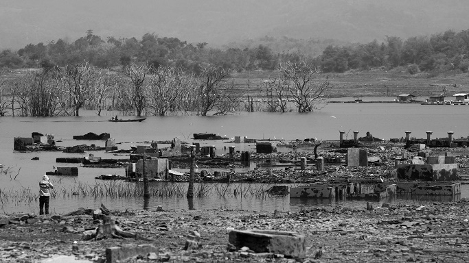 Reruntuhan konstruksi bangunan di dasar Waduk Jatigede kembali muncul dampak dari kekeringan, Desa Cipaku, Kecamatan Darmaraja, Sumedang, Selasa, 3 Oktober 2023. (Foto: Prima Mulia/BandungBergerak.id)Waduk sebagai Spatio-Temporal Fix: Problema Lima Dekade Pembangunan Jatigede