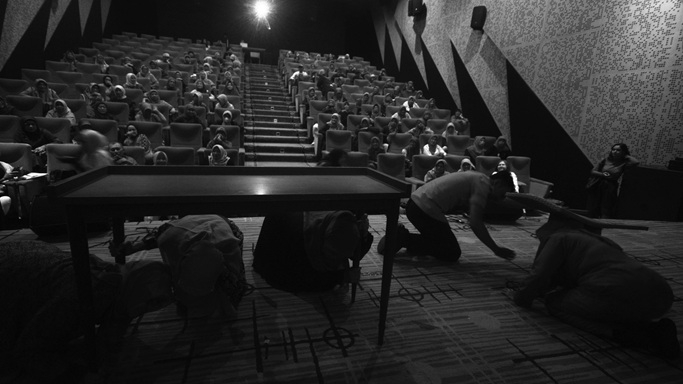 Petugas memberi contoh cara berlindung saat gempa terjadi di dalam ruangan saat edukasi tentang kebencanaan untuk murid Sekolah Lansia Bahagia di Bandung, 21 Januari 2026. (Foto: Prima Mulia/BandungBergerak)Belajar Bertahan di Usia Senja: Lansia Bandung Dibekali Langkah Awal Hadapi Bencana