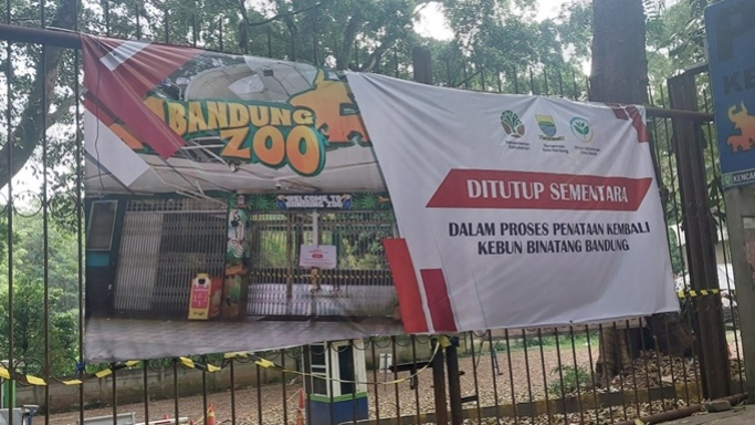 Spanduk penutupan Bandung Zoo oleh Pemerintah Kota Bandung pada 22 Maret 2026. (Foto: Dokumentasi Yudi Hamzah)Saat Libur Lebaran di Bandung Tanpa Kebun Binatang