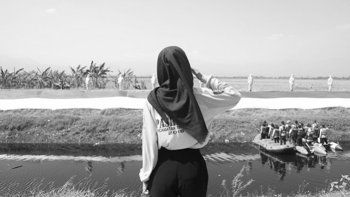 Warga memberi hormat pada bendera merah putih berukuran 3x76 meter dalam peringatan Hari Kemerdekaan Republik Indonesia, Selasa (17/08/2021) siang, di bantaran sungai Cikijing, Kabupaten Bandung, Jawa Barat. Upacara bendera digagas oleh Unit SAR Kota Bandung bersama Pramuka Kwartir Ranting Kecamatan Rancaekek dan komunitas Passer. (Foto: Saman Doye/BandungBergerak.id)Sudah 80 Tahun Merdeka, Rasa Kebangsaan Kita Masih Saja Retak