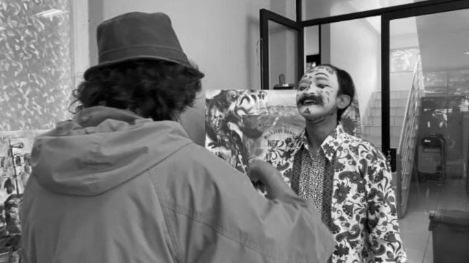 Seniman Tisna Sanjaya melukis di wajah seniman pantomime Wanggi Hoed di Perpustakaan Ajip Rosidi Bandung, Rabu siang, 28 Januari 2026. (Foto: Yopi Muharam/BandungBergerak)Merawat Jejak Ajip Rosidi