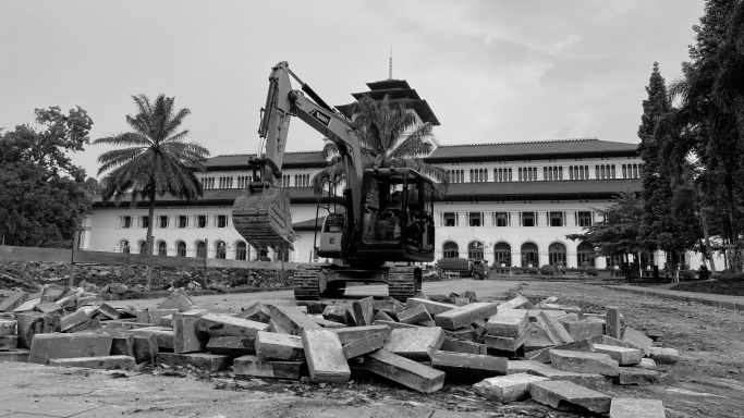 Lengan ekskavator mengayun di halaman depan Gedung Sate, Rabu, 22 April 2026. (Foto: Yopi Muharam/BandungBergerak)Gelombang Protes untuk Proyek Plaza Gedung Sate-Gasibu: Mengabaikan Keterbukaan, Mengesampingkan Kebermanfaatan