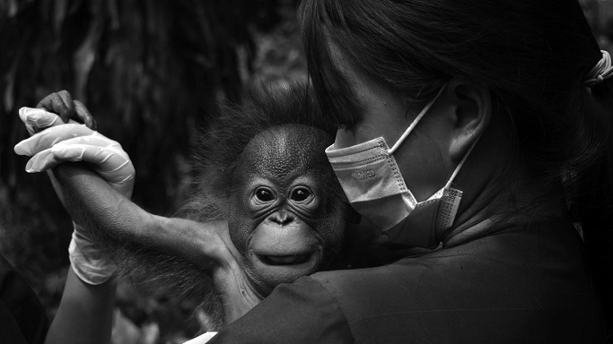Perawat satwa meggendong bayi orang utan berusia 71 hari di klinik satwa Bandung Zoo di Bandung, 21 Februari 2025. (Foto: Prima Mulia/BandungBergerak)Misteri Orang Utan