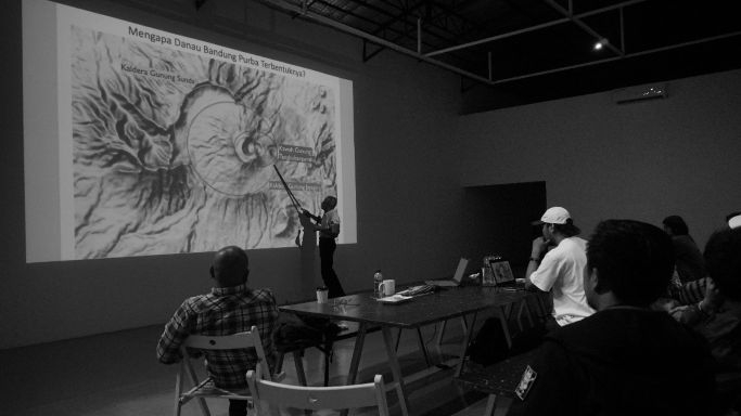 Forum diskusi yang membahas kerja-kerja Kelompok Riset Cekungan Bandung bersama T. Bachtiar di Bale Paragon, Selasar Sunaryo Art Space, Bandung, Kamis, 12 Februari 2026. (Foto: Khoirunnisa Febriani Sofwan/BandungBergerak)Bandung di Ambang Krisis, Mengenal Dampak Betonisasi terhadap Ketersediaan Air Bersih dan Kewaspadaan Gempa Sesar Lembang