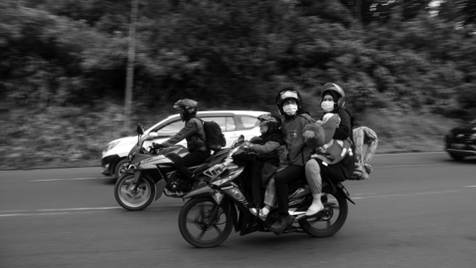 Pemandangan mudik satu keluarga di atas satu unit sepeda motor kembali banyak ditemui di jalur selatan via Nagreg. (Foto: Prima Mulia/BandungBergerak.id)Tidak Pulang di Musim Lebaran, Ketika Biaya Mudik Terlalu Tinggi untuk Perantau