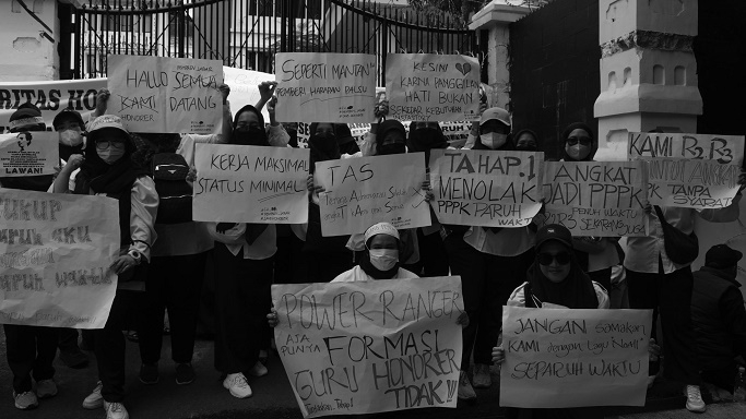 Guru dan pegawai honorer pendidikan melakukan aksi unjuk rasa di gedung DPRD Provinsi Jawa Barat di Bandung, 13 Januari 2025. (Foto: Prima Mulia/BandungBergerak)Hari Guru: Antara Pengabdian dan Kesejahteraan yang Tak Seimbang